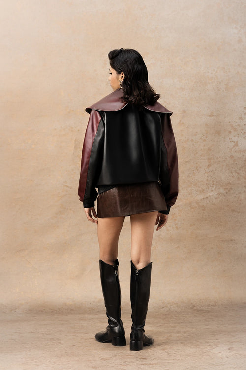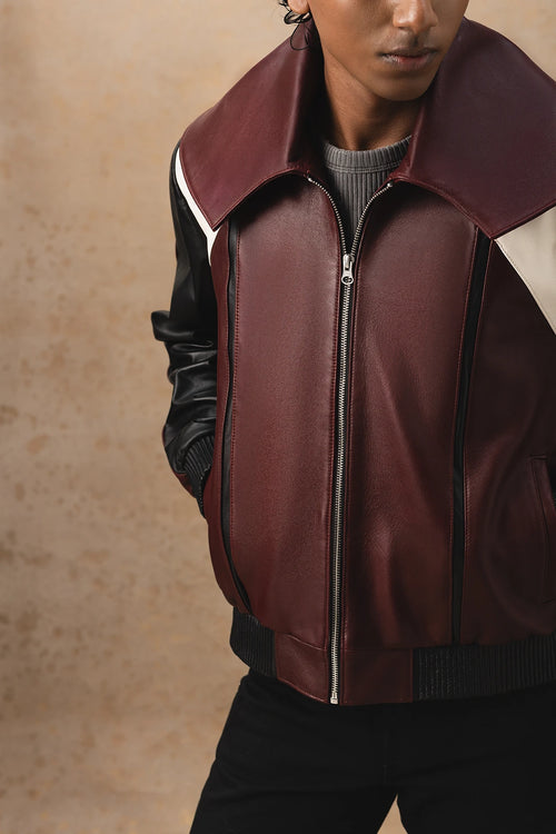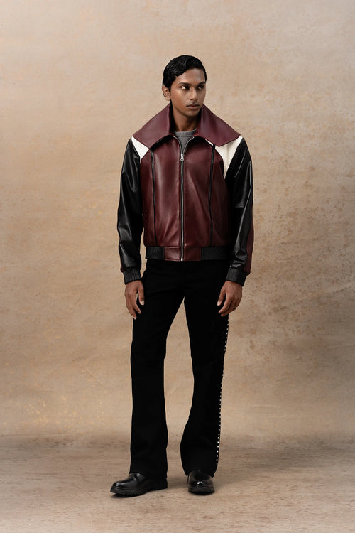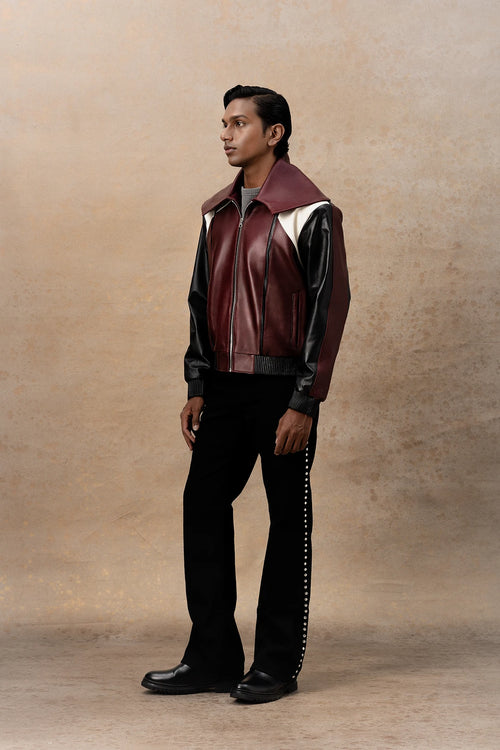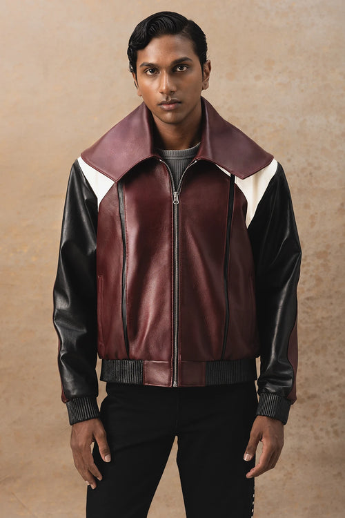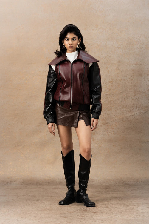 This structured cropped jacket features rich maroon and black leather paneling with contrast inserts, creating an elevated graphic look. Designed with a clean zipper front, exaggerated collar, and ribbed hem for a sharp, modern silhouette.