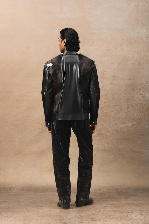 This structured cropped jacket features rich maroon and black leather paneling with contrast inserts, creating an elevated graphic look. Designed with a clean zipper front, exaggerated collar, and rib.