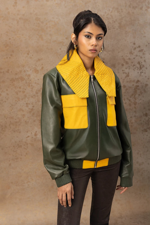 This cropped bomber jacket features deep green and mustard contrast panels with bold geometric seaming, adding a sharp graphic character. Designed with a wide structured collar, dual utility pockets, and a zipper front for a modern utility aesthetic.